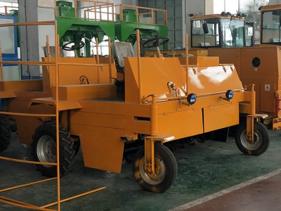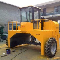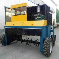 该机采取四轮行走设计,可前进、倒退、转弯,由一人操控驾驶。行驶中整车骑跨在予先堆置的长条形肥基上,由机架下挂装的旋转刀轴对肥基原料实施翻拌、蓬松、移堆,车过之后篡成新的条形垛堆。该机即可在开阔室外露天场地,也可在车间大棚中实施作业。